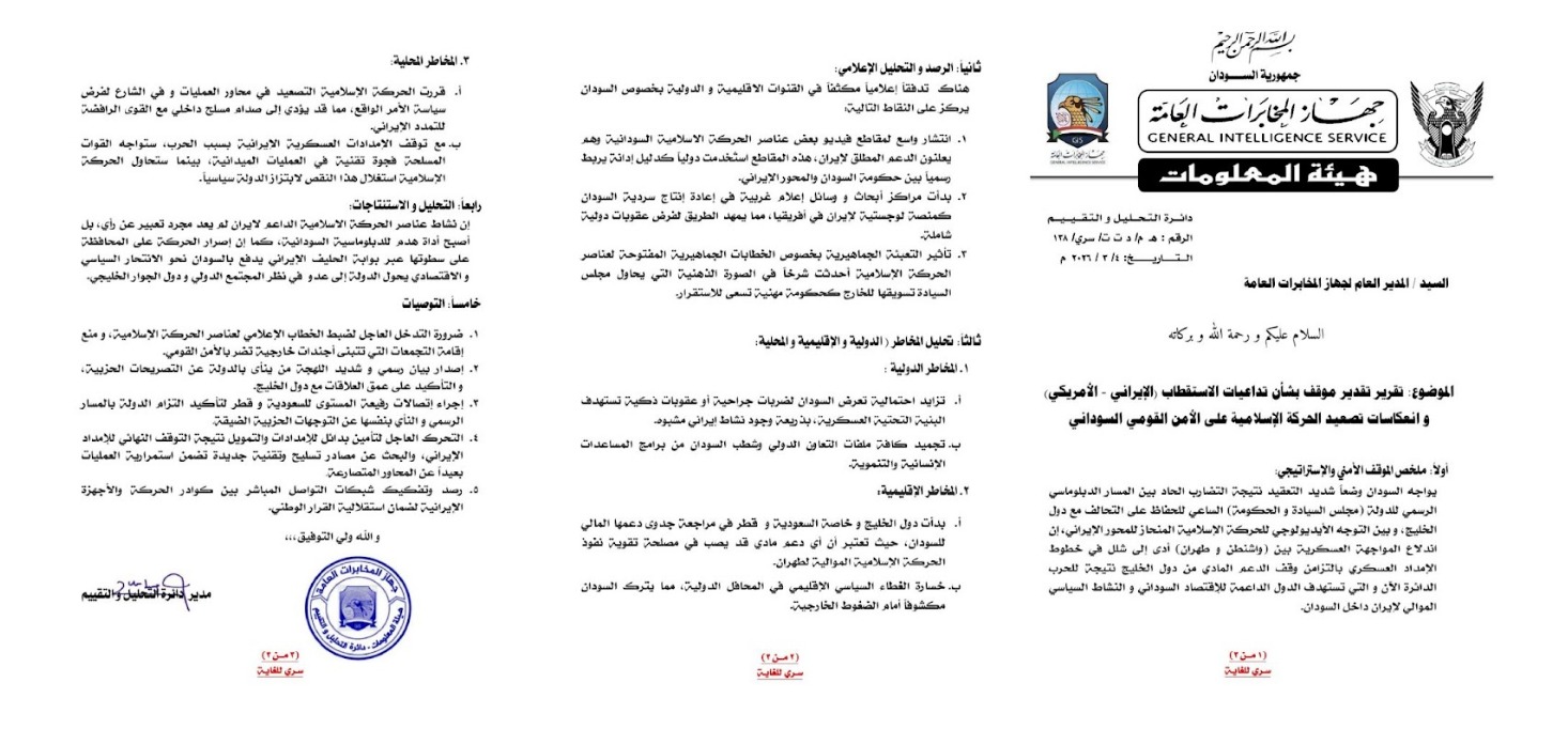 متابعات: نبض نيوز كشفت وثيقة استخباراتية مسربة صادرة عن إدارة التحليل والتقييم بجهاز المخابرات العامة السوداني عن مخاوف متزايدة داخل المؤسسات الأمنية من تداعيات الخطاب السياسي لبعض الجماعات الإسلامية على علاقات السودان الإقليمية، خاصة مع دول الخليج. وبحسب الوثيقة، التي نشرها موقع UKNIP، تراقب الأجهزة المختصة عن كثب التصريحات والمواقف السياسية الأخيرة الصادرة عن أعضاء في الحركة الإسلامية، والتي أظهر بعضها دعماً لإيران في ظل التصعيد الإقليمي المستمر. وحذرت التقييمات الاستخباراتية من أن استمرار هذا الخطاب قد يضع السودان في موقف دبلوماسي حساس، ويعزز لدى بعض الدول الانطباع بأن الخرطوم تميل إلى أحد أطراف الصراع الإقليمي. وأشار التقرير إلى أن هذه التصريحات انتشرت على نطاق واسع عبر وسائل الإعلام ومنصات التواصل الاجتماعي، ما ساهم في تضخيم أثرها الدولي، وفتح المجال أمام جهات خارجية لتصوير السودان سياسياً ودبلوماسياً على أنه قريب من المحور الإيراني. ووفق الوثيقة، تتابع عدة دول في المنطقة، بينها السعودية وقطر، عن كثب التطورات السياسية داخل السودان، لا سيما البيانات الصادرة عن جماعات سياسية يُعتقد أن لها ارتباطات بالمحور الإيراني. وتشير تقديرات الأجهزة الاستخباراتية إلى أن استمرار هذا الخطاب قد يدفع بعض العواصم الخليجية إلى إعادة تقييم مستوى الدعم الاقتصادي والمالي المقدم للسودان. وفي ضوء هذه المخاوف، أوصى التقرير بضرورة التحرك الدبلوماسي العاجل عبر القنوات الرسمية مع الرياض والدوحة لتوضيح الموقف الرسمي للسودان، والتأكيد على أن تصريحات بعض الفصائل السياسية لا تعكس السياسة الخارجية للحكومة. كما شدد التقرير على أهمية الحفاظ على علاقات مستقرة مع دول الخليج، باعتبارها عاملاً أساسياً لدعم الاستقرار الاقتصادي والسياسي في البلاد خلال المرحلة المقبلة. وفي سياق متصل، كشفت الوثيقة عن نقاشات داخل مؤسسات الدولة حول تأمين بدائل عاجلة لتمويل العمليات العسكرية وشراء الأسلحة، بعد تعطل بعض الإمدادات العسكرية الإيرانية نتيجة تصاعد التوترات الإقليمية. وأشار التقرير إلى أن استمرار العمليات الميدانية يتطلب تنويع مصادر الدعم العسكري واللوجستي، محذراً من أن الاعتماد على مصدر خارجي واحد يمثل خطراً استراتيجياً في ظل التحولات المتسارعة في البيئة الإقليمية. كما أوصى التقييم الاستخباراتي بتشديد الرقابة على شبكات الاتصال بين بعض أعضاء الحركة الإسلامية وكيانات إيرانية، والعمل على تفكيك أي قنوات قد تؤثر على استقلال القرار الوطني أو تعرض السودان لضغوط سياسية ودبلوماسية إضافية. وتأتي هذه التوصيات ضمن تقييم استراتيجي أوسع أعدته أجهزة الاستخبارات السودانية بشأن تداعيات المواجهة المتصاعدة بين الولايات المتحدة وإيران، وتأثيراتها المحتملة على المشهدين السياسي والعسكري في السودان. وبحسب الوثيقة، فإن السودان يواجه وضعاً استراتيجياً معقداً نتيجة التباين بين الخطاب الدبلوماسي الرسمي للدولة وبعض التصريحات السياسية التي قد تُفسَّر دولياً على أنها انحياز لإيران، الأمر الذي قد ينعكس على علاقات الخرطوم الإقليمية ومستوى الدعم الخارجي المقدم لها. شارك تصفّح المقالات مقتل 33 شخصاً في قصف بمسيّرتين استهدف سوقين بغرب كردفان مسيّرة تستهدف سوق الجنينة بنيالا تخلف 9 قتلى بينهم نساء