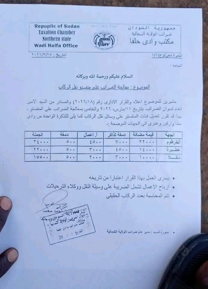 متابعات: نبض نيوز أصدرت مصلحة الضرائب السودانية قرارًا إداريًا جديدًا يحمل الرقم (2026/18)، يقضي بزيادة الرسوم والضرائب المفروضة على تذاكر السفر الداخلي، في خطوة أثارت ردود فعل واسعة، خاصة في أوساط المواطنين العائدين إلى البلاد عبر المعابر الحدودية. وبموجب القرار، تم رفع قيمة الضرائب والدمغات على تذاكر السفر إلى مستويات غير مسبوقة، حيث بلغت الرسوم المفروضة على تذكرة الخرطوم نحو 34 ألف جنيه، فيما حُددت تذاكر بعض الولايات الأخرى بمبالغ متفاوتة، من بينها عطبرة بـ15,500 جنيه، ودنقلا بـ14 ألف جنيه. ويشمل القرار تحصيل ضرائب القيمة المضافة ودمغات التذاكر وأرباح الوكلاء ضمن تكلفة التذكرة النهائية، على أن تتولى شركات النقل عملية التحصيل لصالح الجهات المختصة. ويأتي هذا الإجراء في وقت يشهد فيه السودان عودة أعداد من المواطنين من دول الجوار بعد فترات نزوح ولجوء، الأمر الذي دفع مراقبين إلى التحذير من تأثير هذه الزيادات على أوضاع العائدين، في ظل الأعباء الاقتصادية المتزايدة. ودعا متابعون إلى ضرورة مراجعة القرار ومراعاة الظروف الاستثنائية للعائدين، من خلال تقديم تسهيلات أو إعفاءات مؤقتة تخفف من حدة الضغوط المعيشية التي يواجهونها. شارك تصفّح المقالات شلل في معبر أرقين بعد إضراب سائقي الباصات احتجاجاً على الرسوم